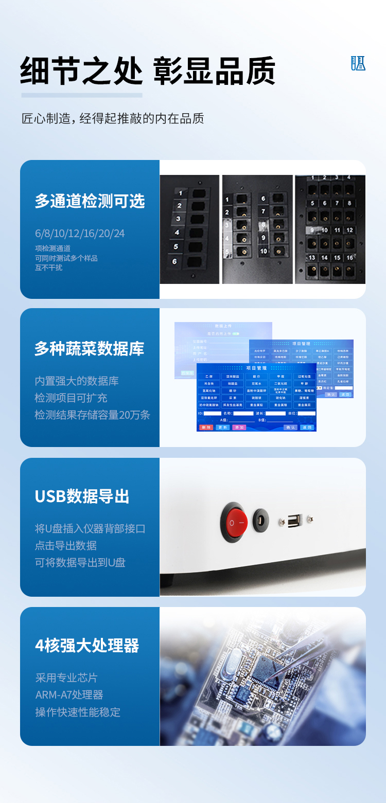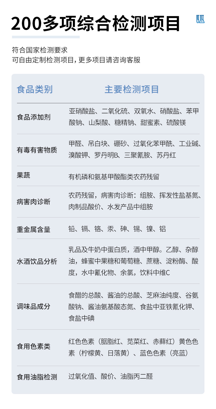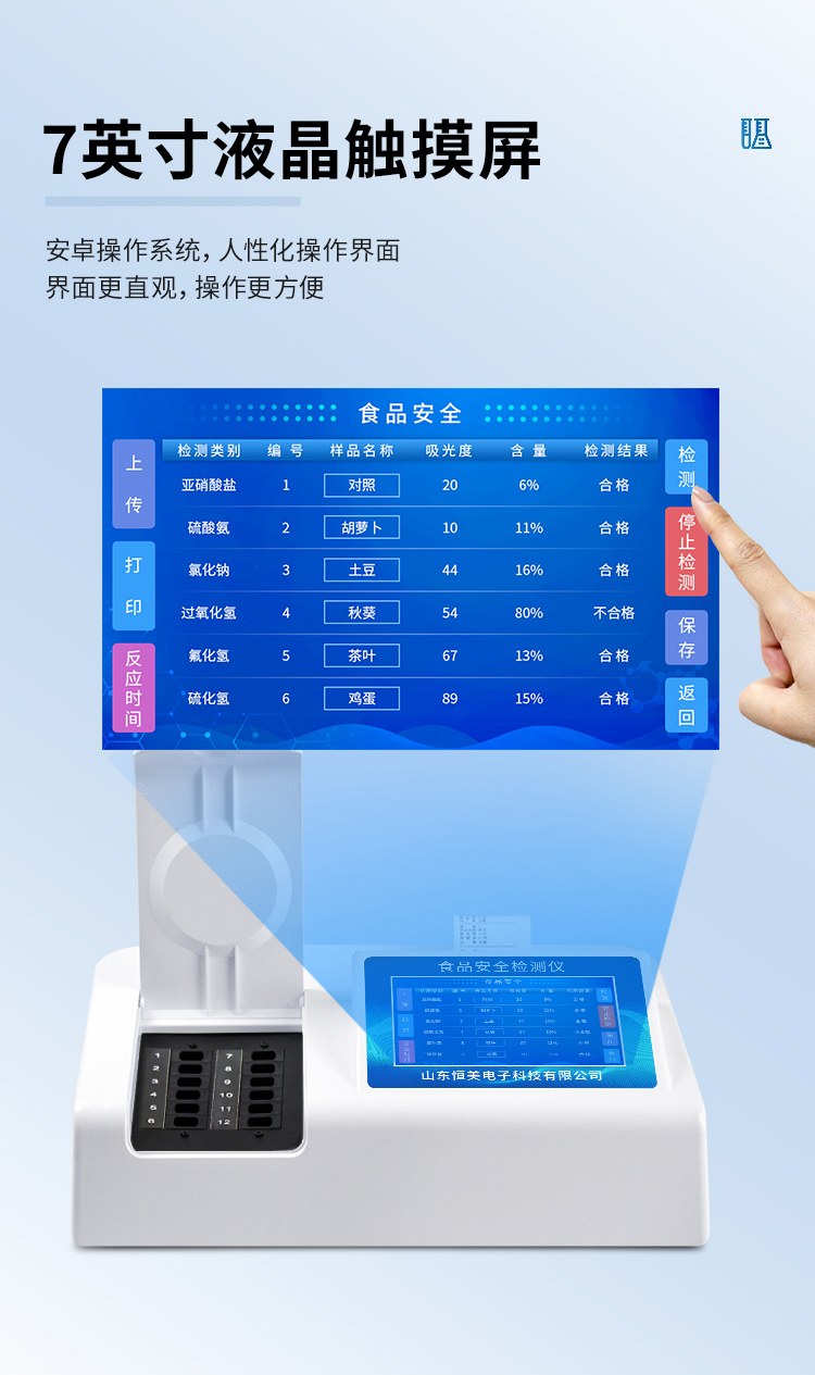 可快速檢測(cè)各類食品中的甲醛、吊白塊、二氧化硫、亞硝酸鹽、雙氧水、硼砂、農(nóng)藥殘留、乳及乳制品中蛋白質(zhì)、硝酸鹽、重金屬鉛的含量,儀器預(yù)留其他項(xiàng)目檢測(cè)程序和端口,根據(jù)日后需求可方便的自主增加檢測(cè)項(xiàng)目。