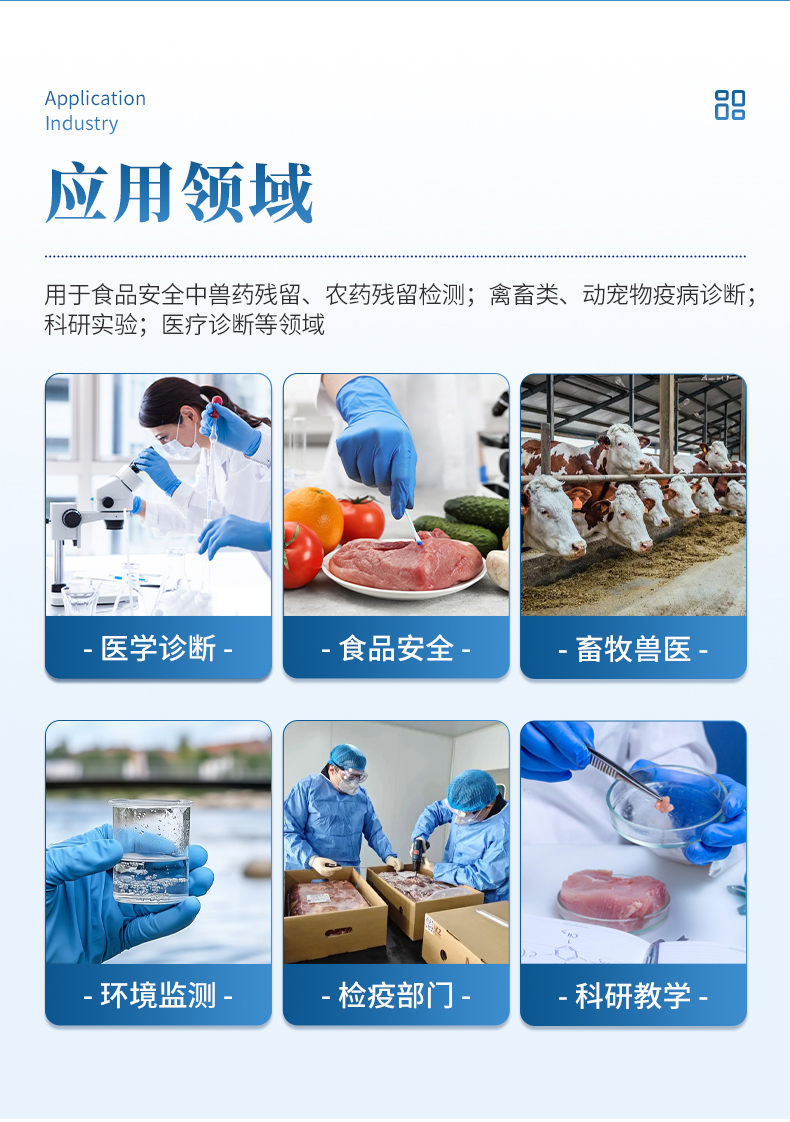 2、畜牧獸醫(yī): 動物疫病診斷、動物源性安全指標檢測。