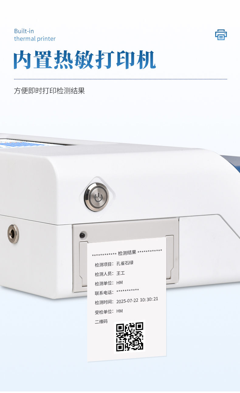 5、內置熱敏打印機,檢測完成即可現(xiàn)場打印標準報告,提升工作效率。