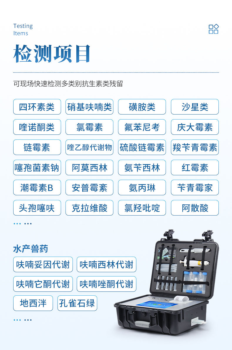 抗生素檢測(cè)儀可現(xiàn)場(chǎng)快速檢測(cè)抗生素類殘留、獸藥殘留、激素類殘留、毒素類殘留,化學(xué)類殘留等多種項(xiàng)目,如可快速檢測(cè)四環(huán)素類、硝基呋喃類、磺胺類、沙星類、喹諾酮類、氯霉素、慶大霉素、鏈霉素、喹乙醇代謝物、硫酸鏈霉素、羧芐青霉素、噻孢菌素鈉、阿莫西林、氨芐西林、紅霉素、潮霉素B、安普霉紊、桿菌肽等抗生素快速檢測(cè);還可檢測(cè)激素類:鹽酸克倫特羅、沙丁胺醇、萊克多巴胺、己烯雌酚等,水產(chǎn)獸藥:呋喃妥因代謝、呋喃西林代謝、呋喃它酮代謝、呋喃唑酮代謝、孔雀石綠等,毒素類:黃曲酶毒素B1、嘔吐毒素、玉米赤霉烯酮、赭曲霉毒素A等,化學(xué)類藥物:氨丙琳、甲基吡啶磷、阿滅丁、雙甲脒、阿散酸、阿維菌素、氮哌酮、芐青霉家、頭孢噻呋、克拉維酸、氯羥吡啶等。