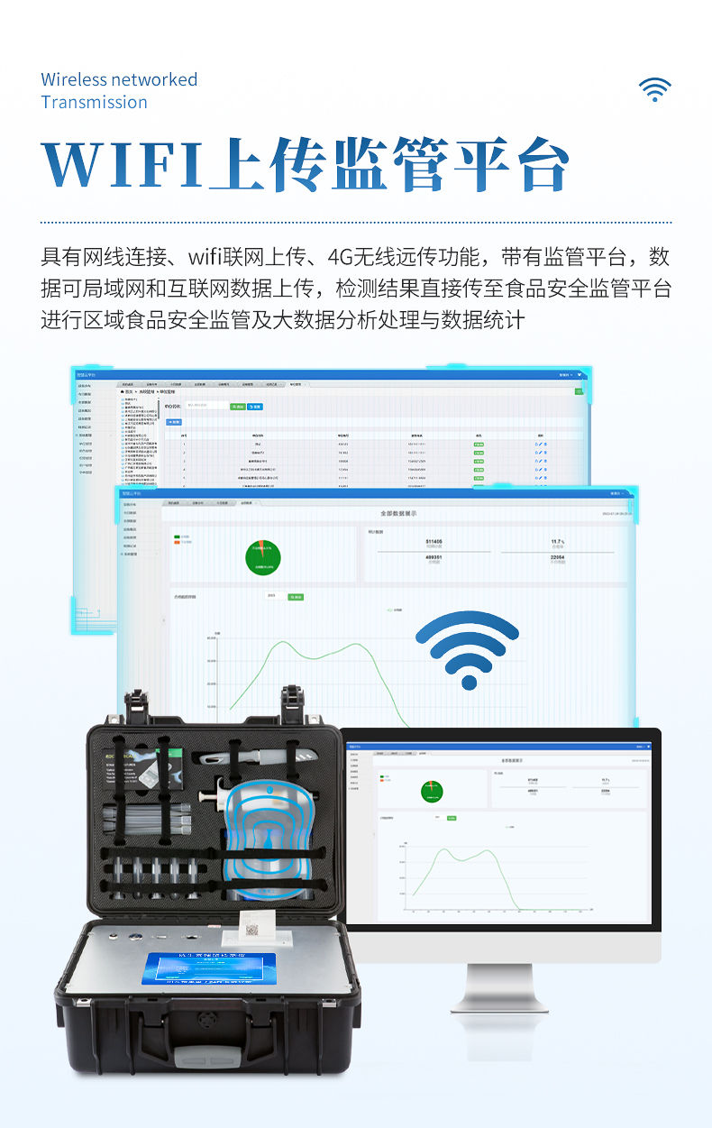 5、儀器帶有監(jiān)管平臺(tái),數(shù)據(jù)可局域網(wǎng)和互聯(lián)網(wǎng)數(shù)據(jù)上傳,檢測(cè)結(jié)果直接傳至食品安全監(jiān)管平臺(tái)。進(jìn)行區(qū)域食品安全監(jiān)管及大數(shù)據(jù)分析處理與數(shù)據(jù)統(tǒng)計(jì),檢測(cè)區(qū)域食品安全長(zhǎng)短期動(dòng)態(tài),達(dá)到食品安全問題預(yù)估、預(yù)警