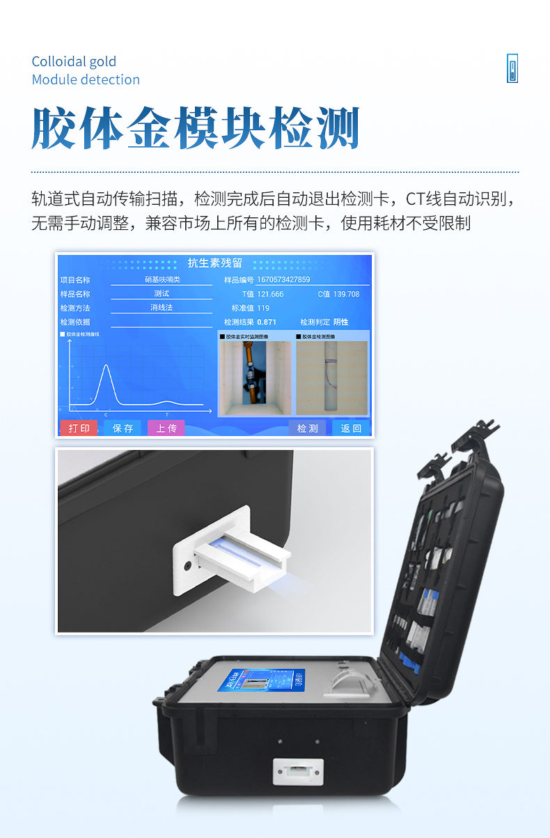 6、一體化主機(jī),包含食品安全檢測(cè)模塊、多通道農(nóng)藥殘留檢測(cè)模塊、膠體金免疫層析檢測(cè)模塊。