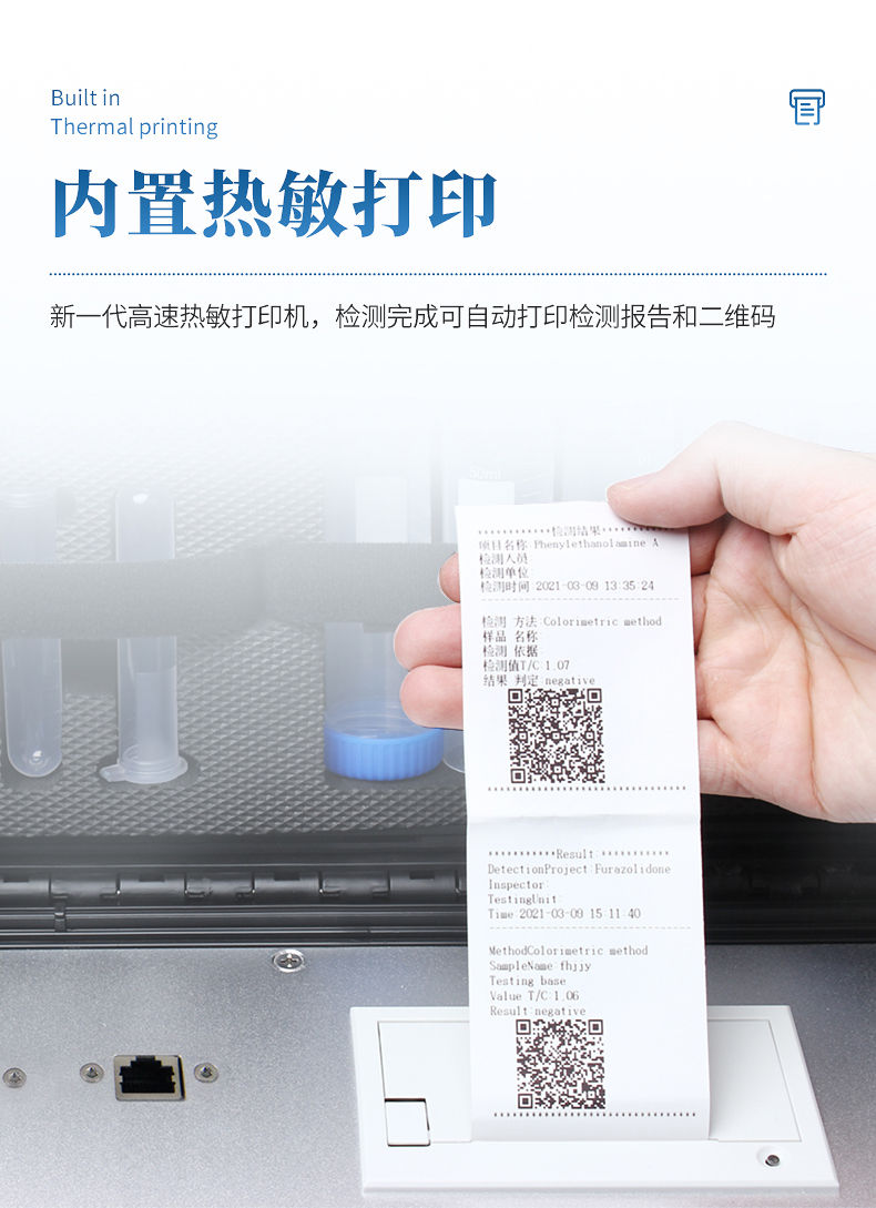 4、新一代高速熱敏打印機(jī),檢測(cè)完成可自動(dòng)打印檢測(cè)報(bào)告和二維碼。