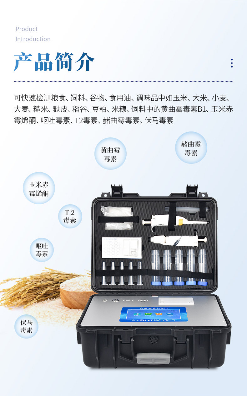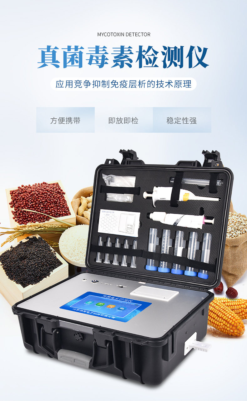 真菌毒素快速檢測儀應(yīng)用競爭抑制免疫層析的技術(shù)原理,通過就是通過待檢測物與抗體結(jié)合的方法,分析待檢樣品中真菌毒素殘留??煽焖贆z測糧食、飼料、谷物、食用油、調(diào)味品中如玉米、大米、小麥、大麥、糙米、麩皮、稻谷、豆粕、米糠、飼料中的黃曲霉毒素B1、玉米赤霉烯酮、嘔吐毒素、T2毒素、赭曲霉毒素、伏馬毒素。