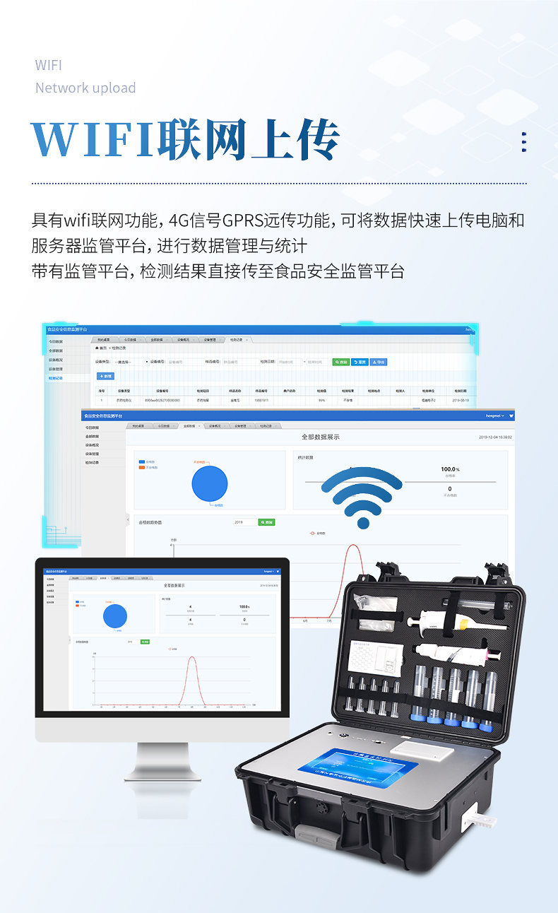 6、儀器具有wifi聯(lián)網(wǎng)功能,4G信號GPRS遠(yuǎn)傳功能,可插手機(jī)卡實現(xiàn)數(shù)據(jù)遠(yuǎn)傳,可將數(shù)據(jù)快速上傳電腦和服務(wù)器監(jiān)管平臺,進(jìn)行數(shù)據(jù)管理與統(tǒng)計。