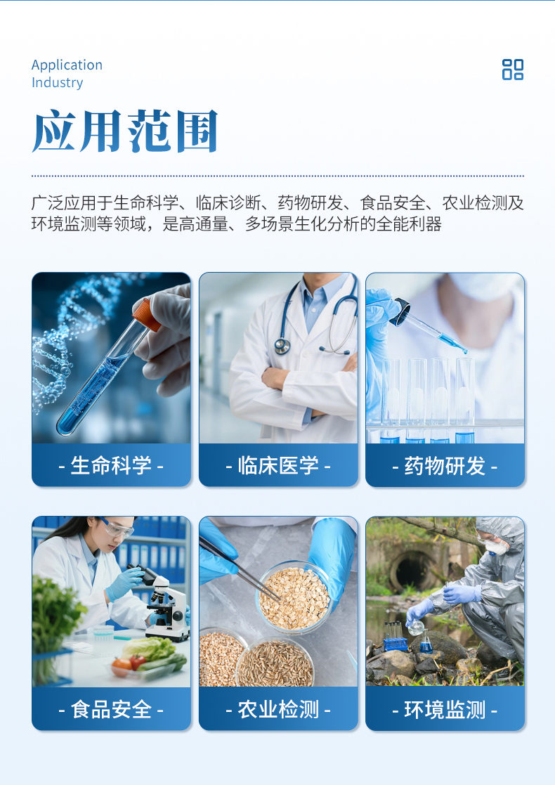全波長酶標(biāo)儀主要應(yīng)用于生命科學(xué)與醫(yī)學(xué)研究領(lǐng)域,是進(jìn)行蛋白質(zhì)定量、核酸濃度測量、酶動力學(xué)研究、細(xì)胞活性與毒性檢測以及ELISA實(shí)驗(yàn)的基石,廣泛應(yīng)用于高校、科研院所和醫(yī)院實(shí)驗(yàn)室。在醫(yī)藥與生物技術(shù)行業(yè),它是藥物研發(fā)過程中進(jìn)行高通量篩選、藥效毒理評估及生物制品質(zhì)量控制的必備工具;在農(nóng)業(yè)與食品安全領(lǐng)域,用于檢測作物病害、食品中的過敏原、毒素及農(nóng)藥殘留;在環(huán)境監(jiān)測方面,它還可用于分析水體和土壤中的污染物,成為保障公共安全的重要工具。