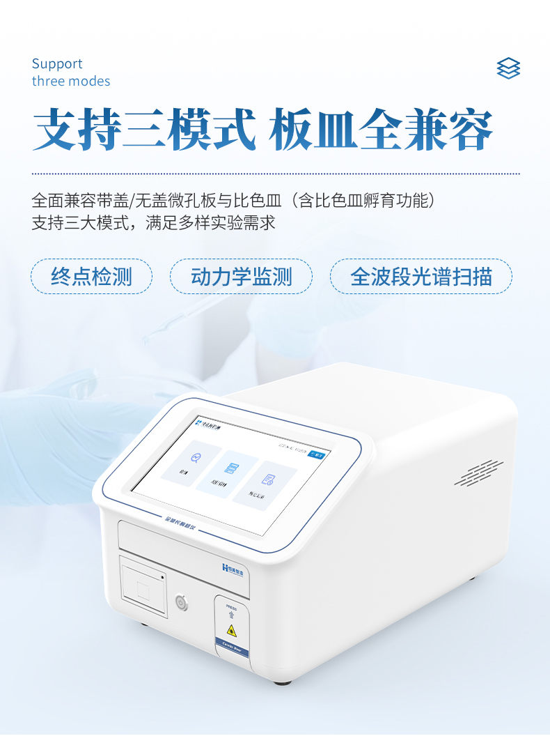 8. 支持終點(diǎn)檢測、動力學(xué)監(jiān)測、全波段光譜掃描三大模式,兼容帶蓋/無蓋微孔板及比色皿(含比色皿孵育功能);