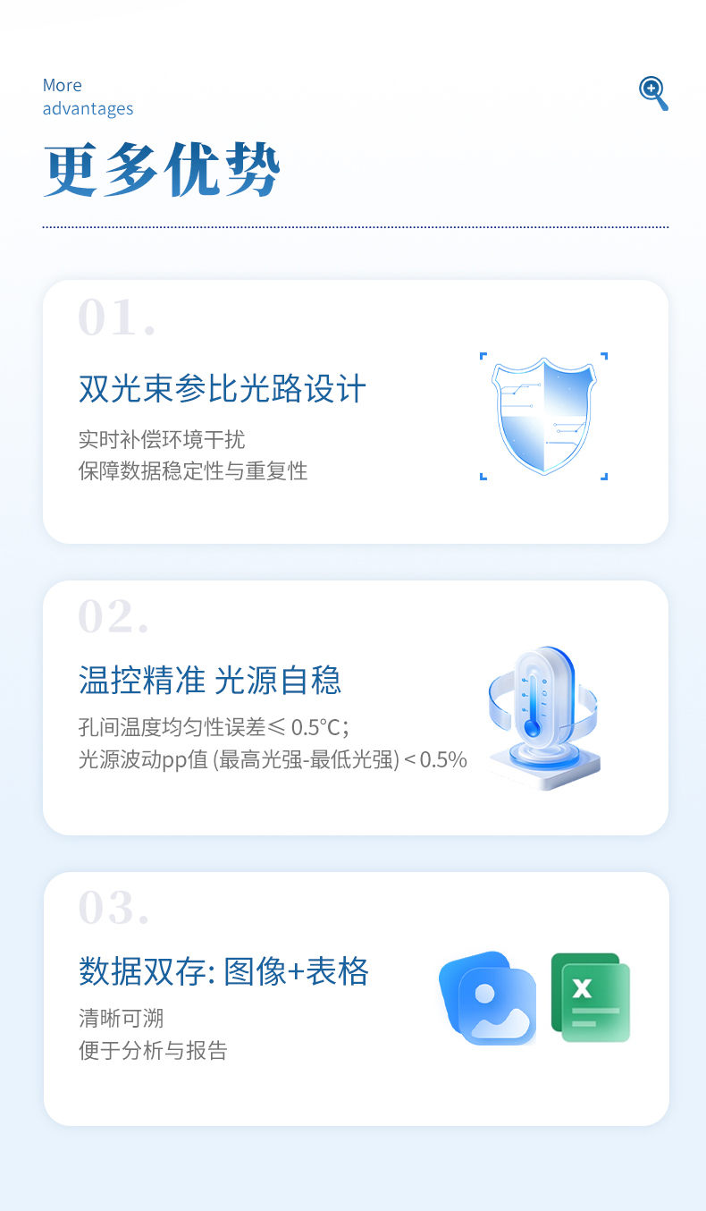 7. 雙光束參比光路設(shè)計,實(shí)時補(bǔ)償環(huán)境干擾,保障數(shù)據(jù)穩(wěn)定性與重復(fù)性;