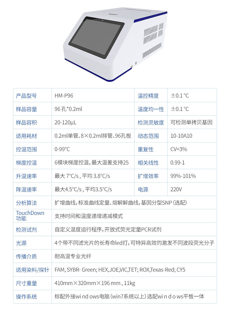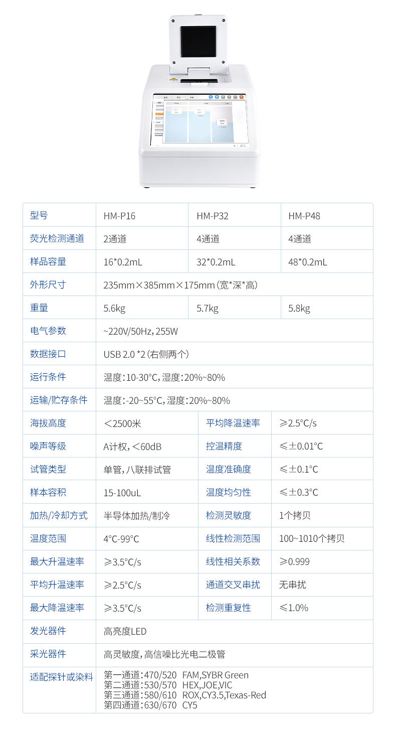 HM-P32型號 實時熒光定量PCR系統(tǒng)主要用于運行實時熒光定量PCR實驗,通過熒光激發(fā)和采集的方式,對實驗過程進行實時監(jiān)控,將實驗過程數(shù)據(jù)繪制成熒光曲線,實時呈現(xiàn)于儀器顯示界面,并對實驗數(shù)據(jù)進行擬合和分析,*后可生成PDF格式的實驗報告。