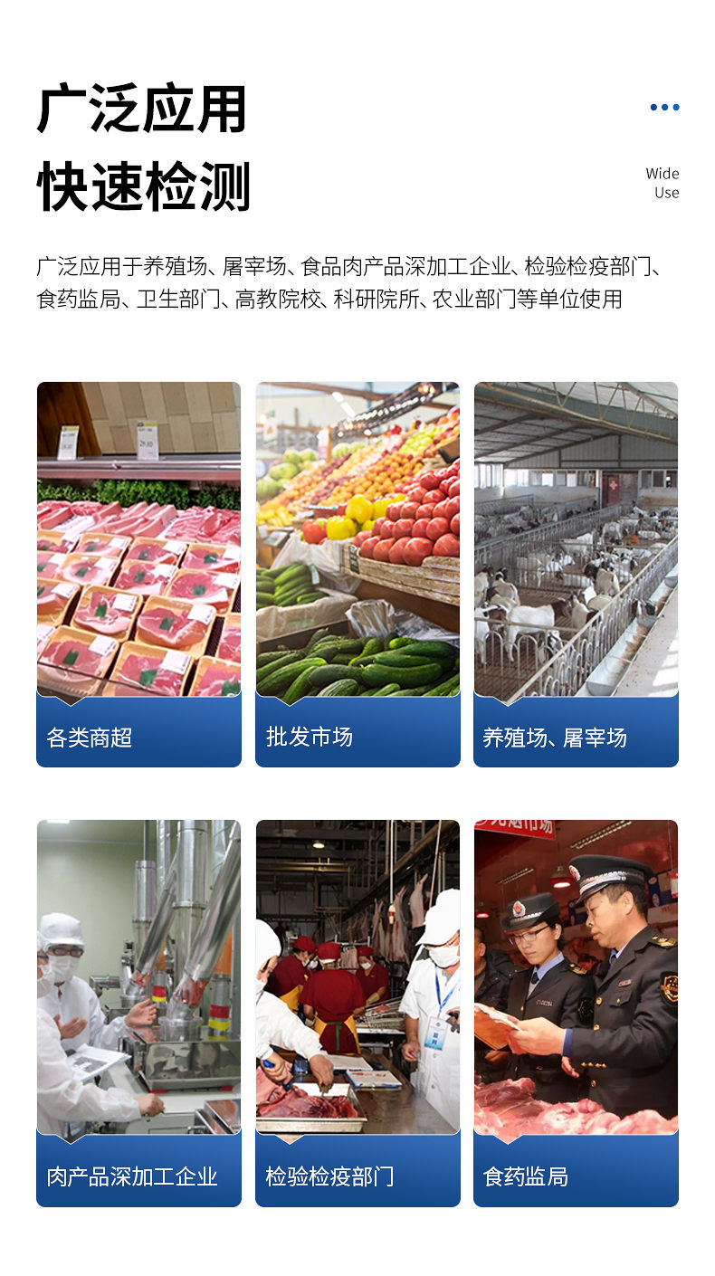 該肉制品檢測(cè)儀為集成化肉品安全快速檢測(cè)分析設(shè)備,廣泛應(yīng)用于養(yǎng)殖場(chǎng)、屠宰場(chǎng)、食品肉產(chǎn)品深加工企業(yè)、檢驗(yàn)檢疫部門、食藥監(jiān)局、衛(wèi)生部門、高教院校、科研院所、農(nóng)業(yè)部門等單位使用。
