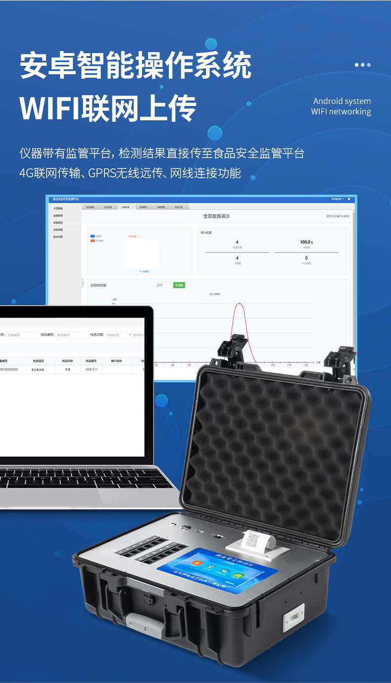 4、儀器帶有監(jiān)管平臺(tái),數(shù)據(jù)可局域網(wǎng)和互聯(lián)網(wǎng)數(shù)據(jù)上傳,檢測(cè)結(jié)果直接傳至食品安全監(jiān)管平臺(tái)。進(jìn)行區(qū)域食品安全監(jiān)管及大數(shù)據(jù)分析處理與數(shù)據(jù)統(tǒng)計(jì),檢測(cè)區(qū)域食品安全長(zhǎng)短期動(dòng)態(tài),達(dá)到食品安全問題預(yù)估、預(yù)警