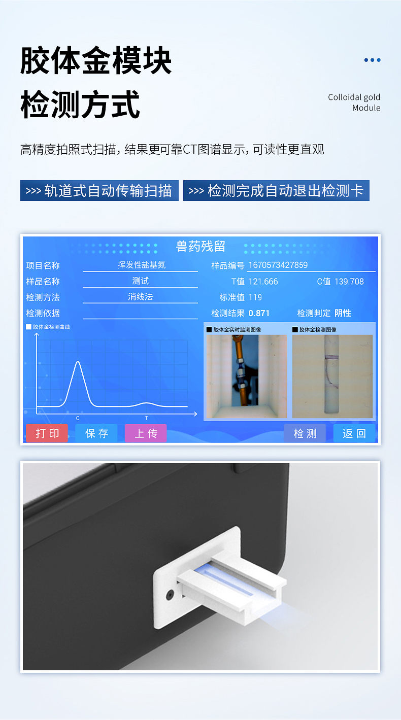 7、膠體金模塊檢測(cè)方式:軌道式自動(dòng)傳輸掃描,檢測(cè)完成后自動(dòng)退出檢測(cè)卡。