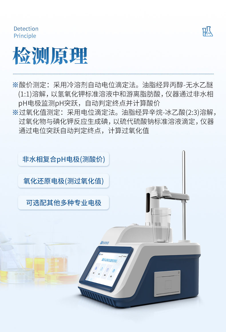 過氧化值測定:采用電位滴定法。油脂經(jīng)異辛烷-冰乙酸(2:3)溶解,過氧化物與碘化鉀反應(yīng)生成碘,以硫代硫酸鈉標準溶液滴定,儀器通過電位突躍自動判定終點,計算過氧化值。