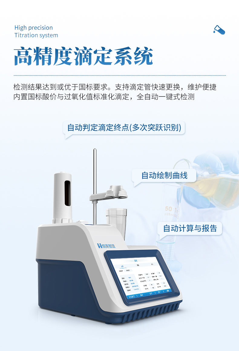 3.內(nèi)置國標酸價與過氧化值標準化滴定,自動判定滴定終點(多次突躍識別)、自動繪制曲線、自動計算與報告的“全自動”一鍵式檢測;
