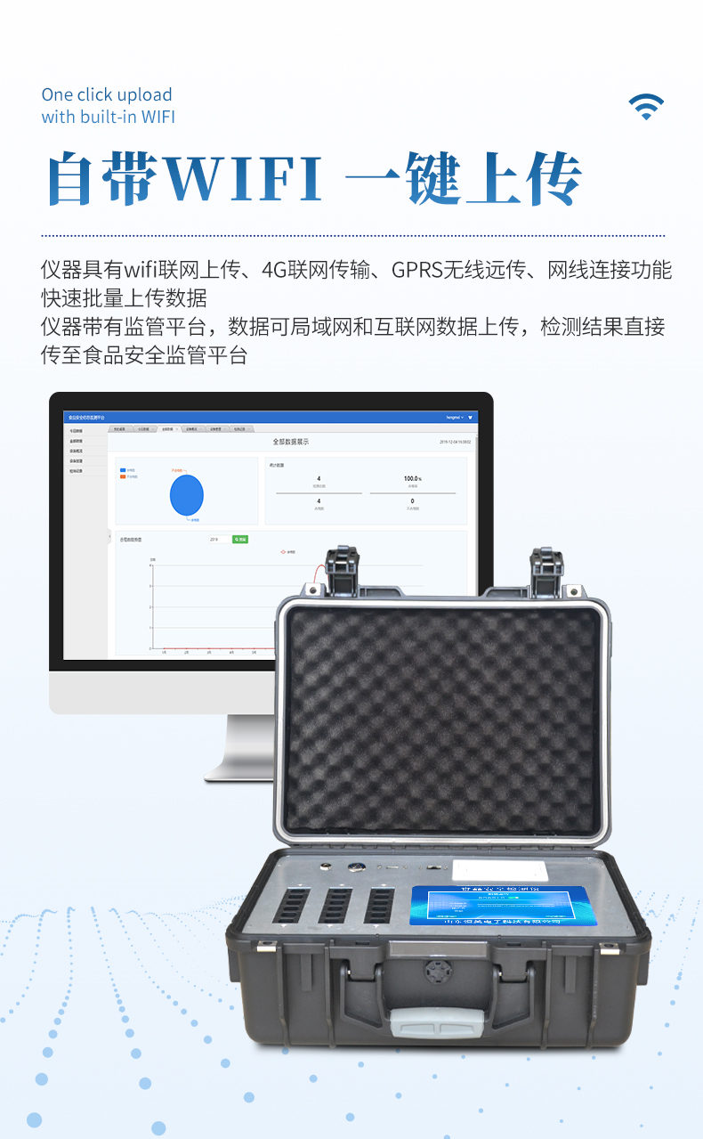 4、儀器帶有監(jiān)管平臺,數(shù)據(jù)可局域網(wǎng)和互聯(lián)網(wǎng)數(shù)據(jù)上傳,檢測結(jié)果直接傳至食品安全監(jiān)管平臺。進(jìn)行區(qū)域食品安全監(jiān)管及大數(shù)據(jù)分析處理與數(shù)據(jù)統(tǒng)計,檢測區(qū)域食品安全長短期動態(tài),達(dá)到食品安全問題預(yù)估、預(yù)警