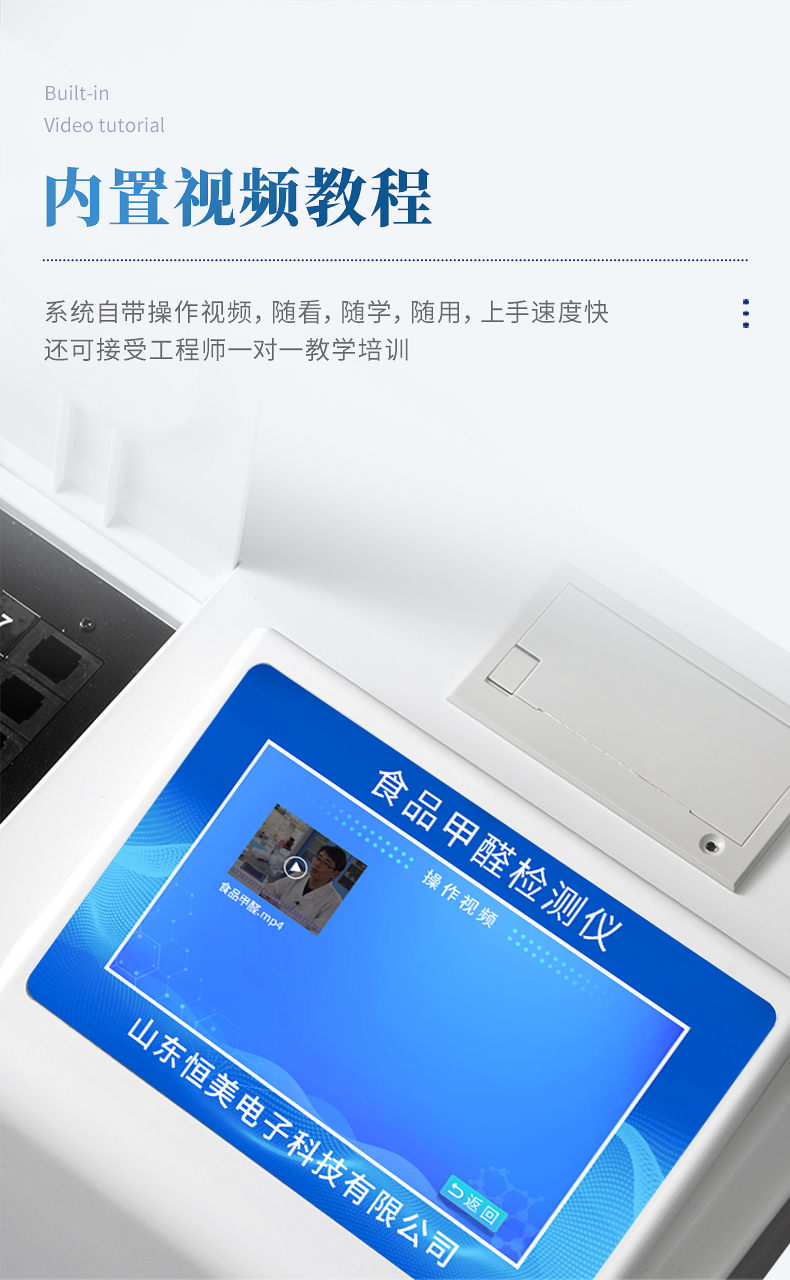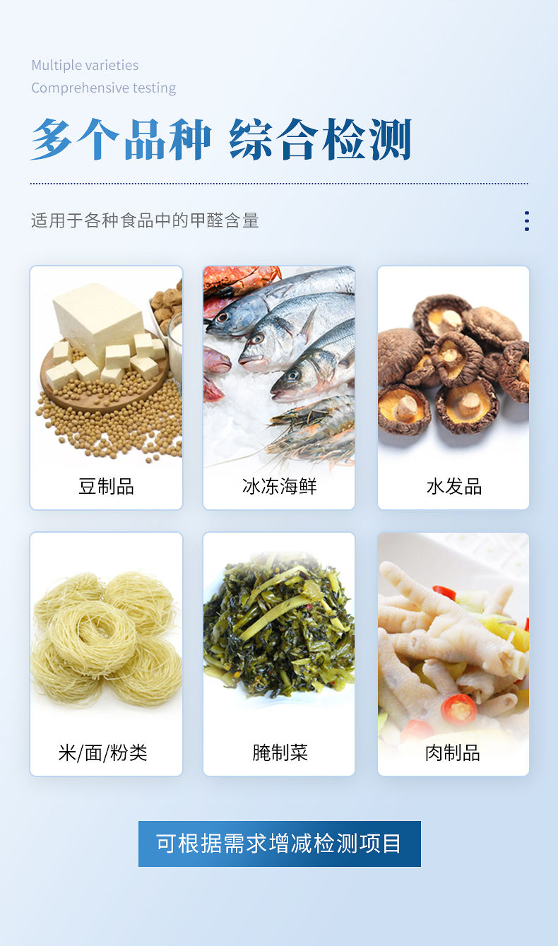 1、檢測項目:可快速定量檢測各類食品中的甲醛的含量,儀器預留其他項目檢測程序和端口,根據日后需求可方便的自主增加檢測項目。日后可升級為檢測,水產品,肉制品,面制品的綜合類型儀器。