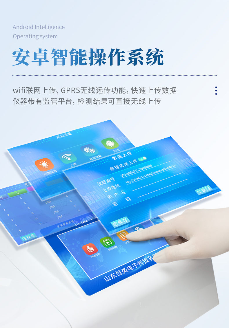 1、安卓智能操作系統,采用更加高效和人性化操作,儀器具有網線連接、wifi聯網上傳、GPRS無線遠傳功能,快速上傳數據。