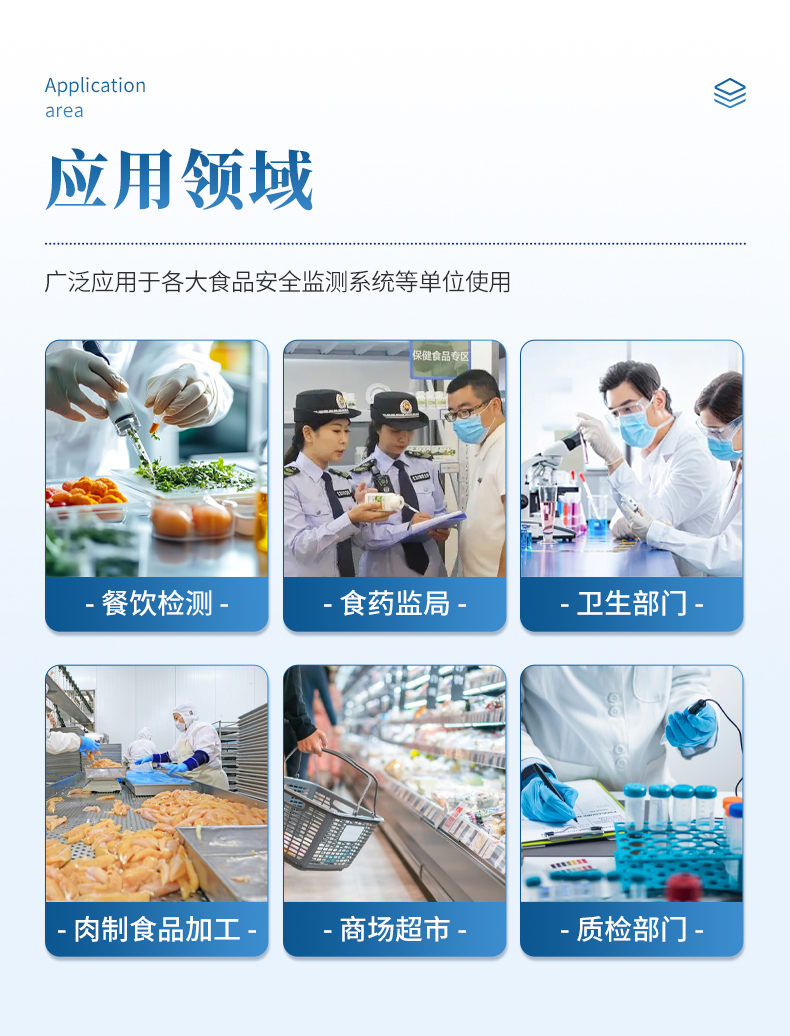 廣泛應(yīng)用于餐飲檢測、食藥監(jiān)局、衛(wèi)生部門、肉制食品深加工企業(yè)、商場超市、質(zhì)量監(jiān)督檢驗、工商管理各大食品安全監(jiān)測系統(tǒng)等單位使用。