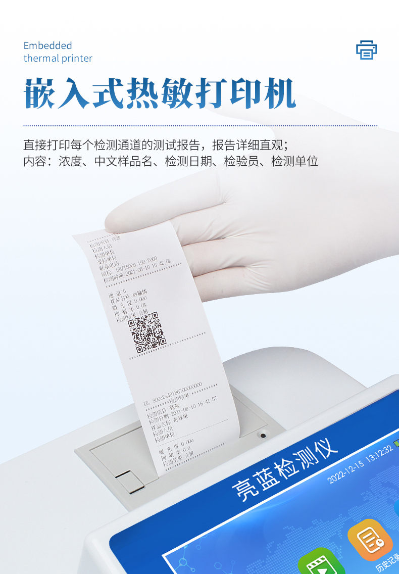 ●帶有嵌入式微型熱敏打印機,直接打印每個檢測通道的測試報告,報告詳細直觀,內(nèi)容:濃度、中文樣品名、檢測日期、檢驗員、檢測單位