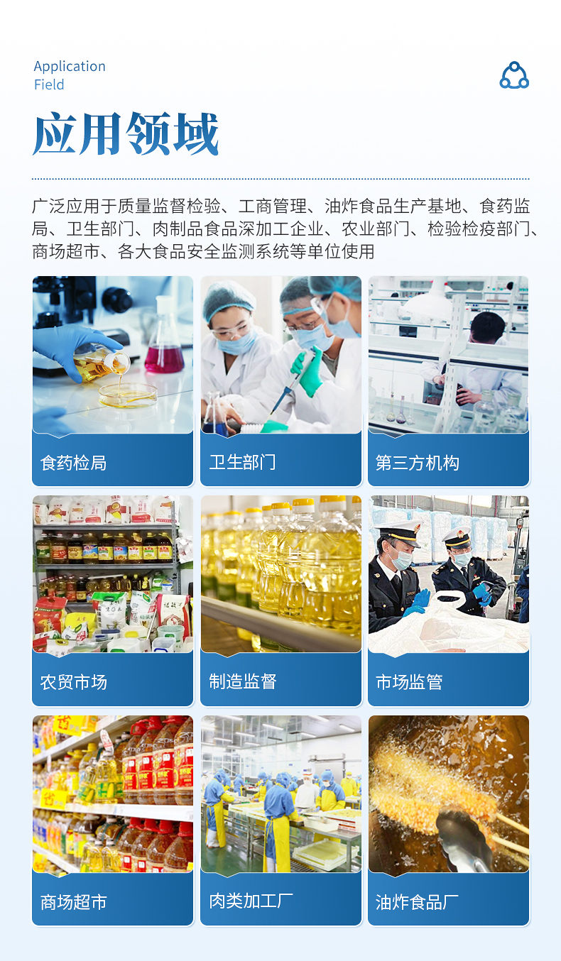 廣泛應(yīng)用于質(zhì)量監(jiān)督檢驗(yàn)、工商管理、油炸食品生產(chǎn)基地、食藥監(jiān)局、衛(wèi)生部門、肉制品食品深加工企業(yè)、商場超市、各大食品安全監(jiān)測系統(tǒng)等單位使用。